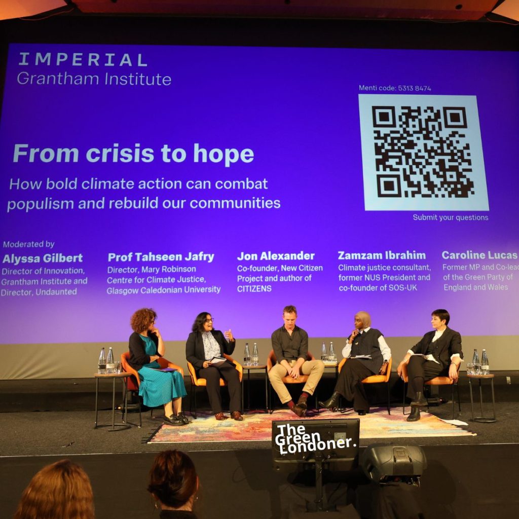 Last night, Caroline Lucas, former Green MP and party leader, delivered the Grantham Institute’s annual lecture at Imperial College London, speaking to a full house. In her straightforward yet impactful style, Caroline tackled the significant challenges of the low-carbon transition, the role of the UK government, and the urgent need to reinvent a positive narrative in an increasingly polarised political landscape.