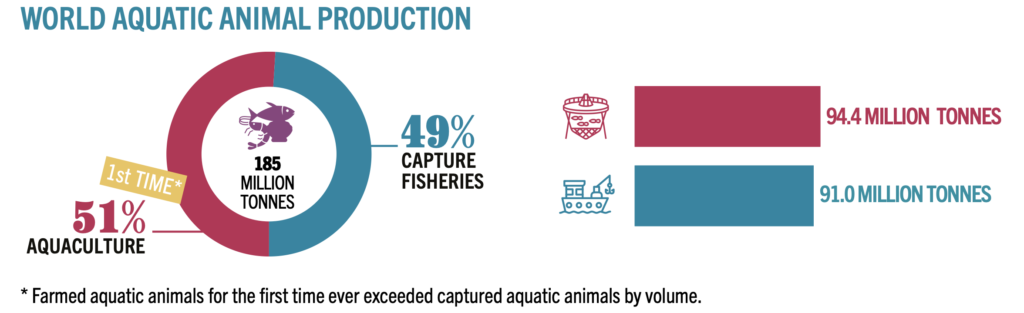 In 2022, for the first time, the production of farmed fish surpassed wild-caught fish, reaching 94.4 million tonnes and representing 51% of the world’s total. Source: The State of the World Fisheries and Aquaculture (Food and Agriculture Organization, 2024)
